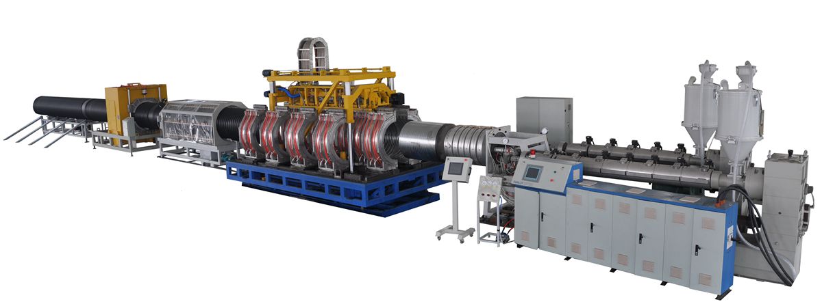 HDPE双壁波纹管设备是以高密度聚乙烯为主要原料,分别由内、外挤出机共同挤出,一次成型,内壁平滑,外壁呈梯形波纹状,内外壁之间有夹壁空心层的塑料管材。双壁波纹管设备产品具有环刚度高、强度大、重量轻、隔音减震,较高的抗紫外线稳定性,使用寿命长,弯曲性好,耐压,抗冲击强度高等多种优点。可敷设在地质较差的路段,而且密封性好,施工快捷。
