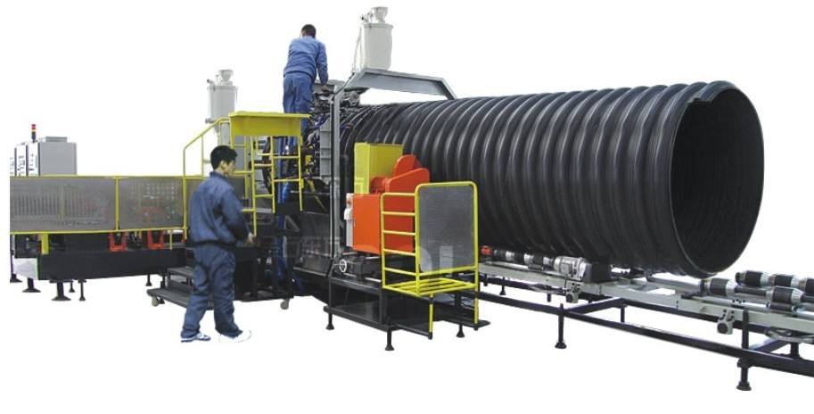 HDPE双壁波纹管设备是以高密度聚乙烯为主要原料,分别由内、外挤出机共同挤出,一次成型,内壁平滑,外壁呈梯形波纹状,内外壁之间有夹壁空心层的塑料管材。双壁波纹管设备产品具有环刚度高、强度大、重量轻、隔音减震,较高的抗紫外线稳定性,使用寿命长,弯曲性好,耐压,抗冲击强度高等多种优点。可敷设在地质较差的路段,而且密封性好,施工快捷。