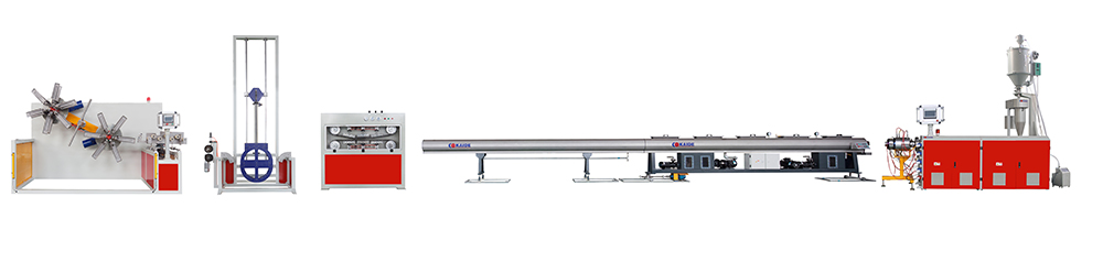 该生产线由采用德国制造,采用挤出机、配以高扭力减速箱、新型开槽机筒、LTM螺杆、挤出量大、物料熔温低、真正实现低温塑化。机头模具为螺旋分流式机头或篮式机头,可配静态混炼系统,内部压力分布更均匀。真空定径箱为两段式,完善的水温、水位以及流量控制,确保生产出高质量的管材。生产线稍作变化,配不同模具、螺杆及附属设备,可生产PE、ABS、PERT、REX-B管以及两种不同材料的塑料复合管。同时根据PPR、PPB的加工性能设计制造的挤出机,配以进口减速箱、新型开槽机筒、BM螺杆,挤出量大,物料熔温低,节能效果显著。螺旋分流式机头,可配静态混炼系统,料层彼此充分叠加,与传统支架式模头相比较,内壁压力分布更均匀。特殊设计的真空定径和冷却系统,水槽不锈钢板制作,采用多段式水模冷却,确保高速生产厚壁管及大口径管的要求。